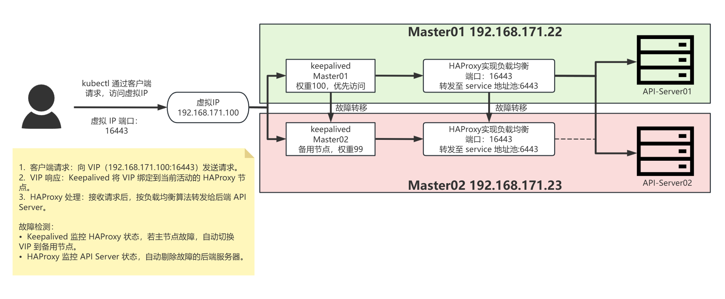 备用节点必须运行 HAProxy:若 HAProxy 仅部署在主节点(错误配置),则故障后无法工作。